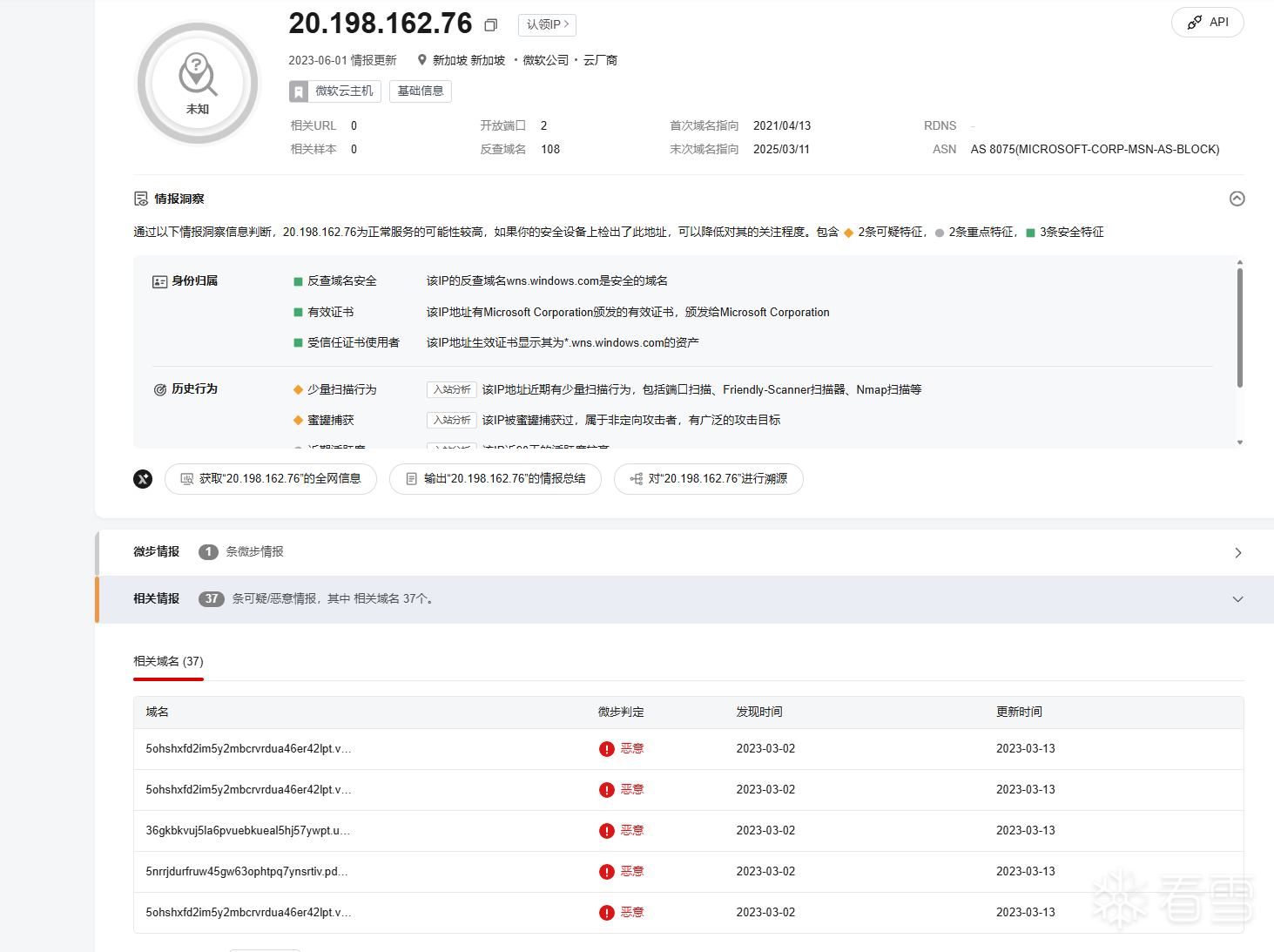 执行完后与ip156.251.17.107和20.150.79.68进行通信,通过威胁情报社区查询发现