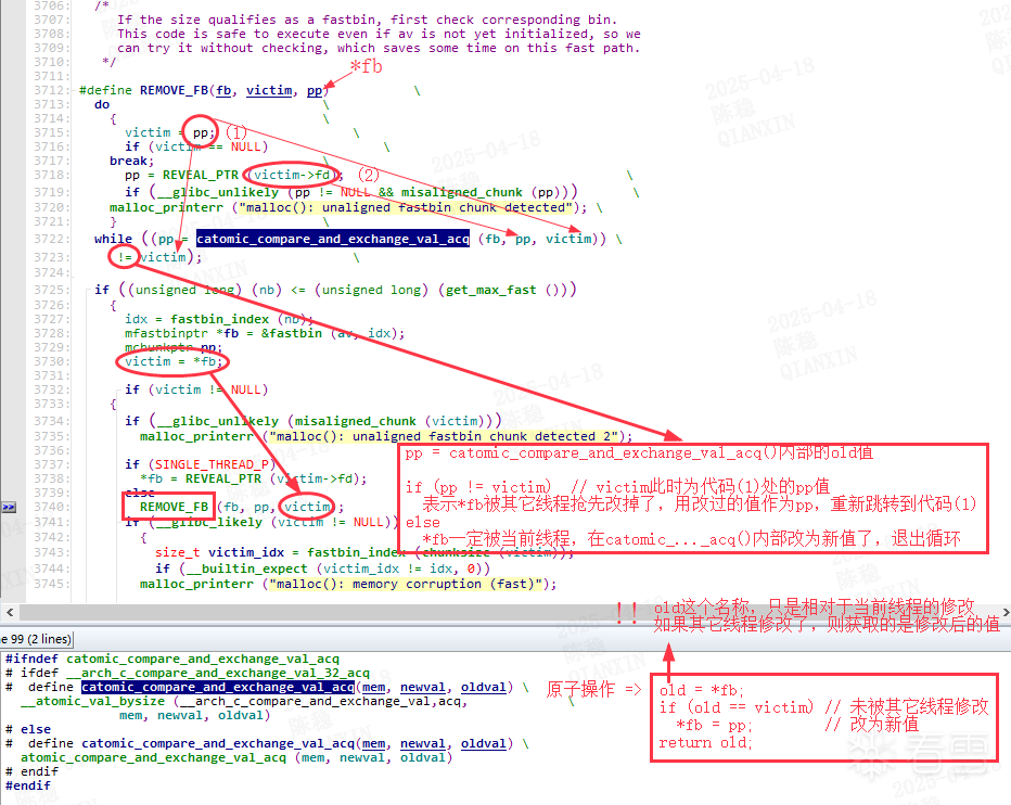 为了防止多线程之间的干扰,REMOVE_FB()宏内部,使用了catomic_compare_and_exchange_val_acq()这种CAS操作接口: