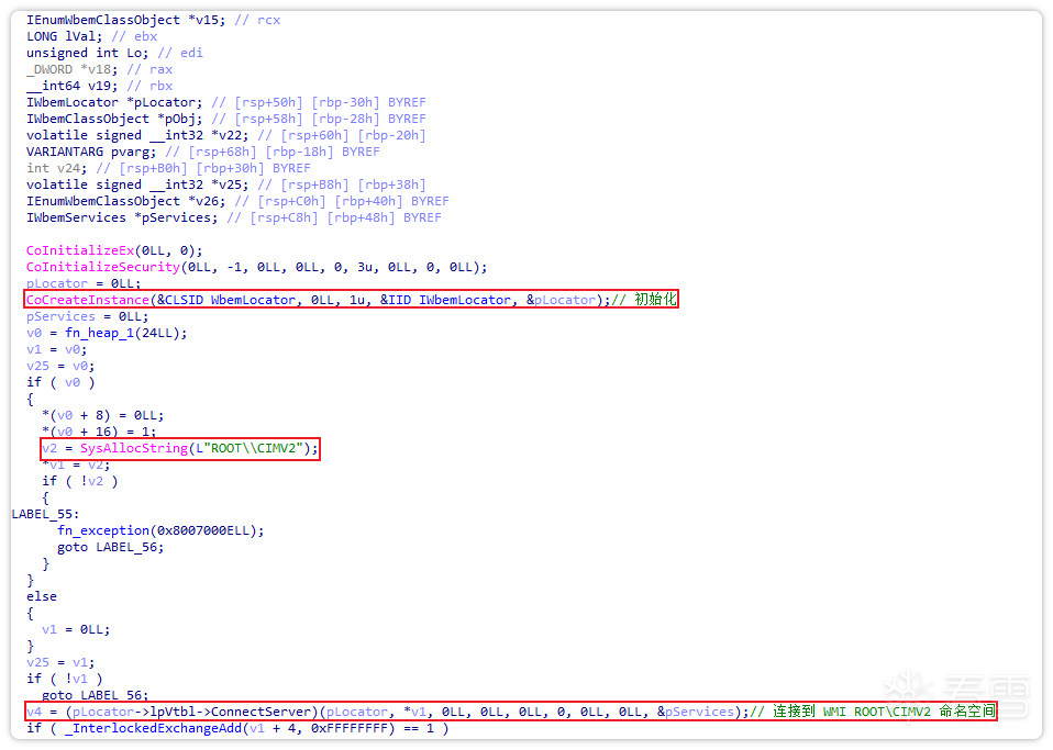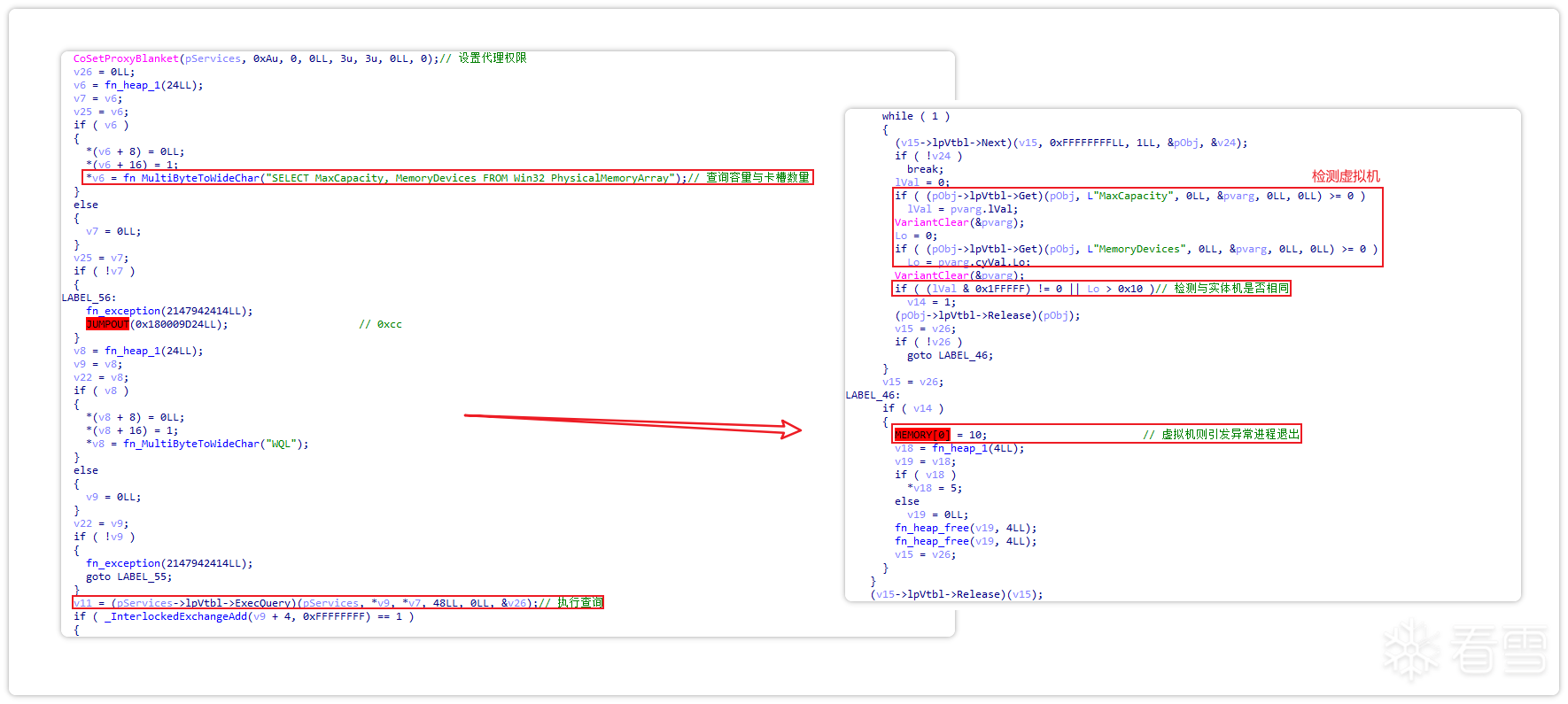 首先,样本利用com组件4590f811-1d3a-11d0-891f-00aa004b2e24进行WMI查询,通过查询物理内存以及内存插槽数量来判断是否处于虚拟机环境。