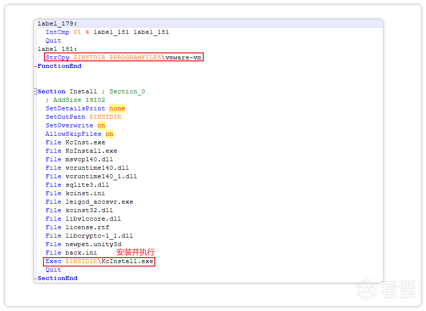 对其进行分析发现,它会将白加黑文件安装到$PROGRAMFILES\vmware-vm文件夹中,安装完成后,nsi脚本中的Exec $INSTDIR\KcInstall.exe会进一步执行白加黑文件。