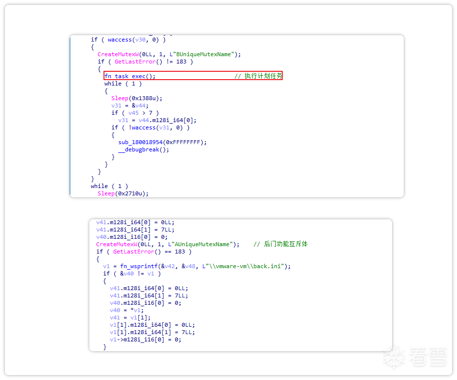 其中,AUniqueMutexName用来实现后门功能,BUniqueMutexName用来执行计划任务。