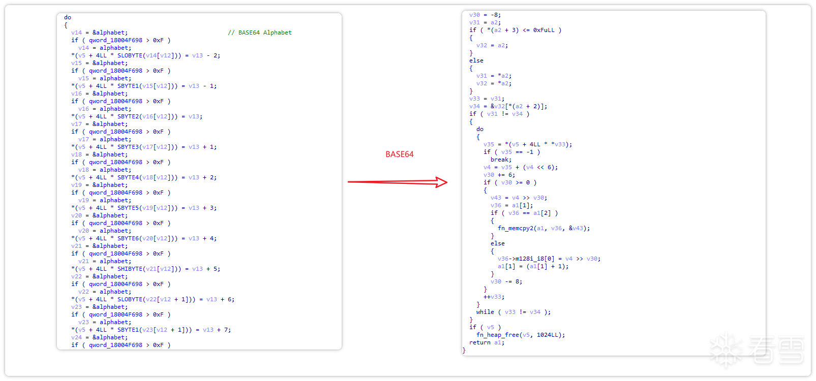 对该恶意代码进行分析发现,其采用自写Base64字母系统进行加解密。该字母系统为!@#$%^&*()_+~ABCDEFGHIJKLMNOPQRSTUVWXYZabcdefghijklmnopqrstuvwxyz,其解密算法如下。