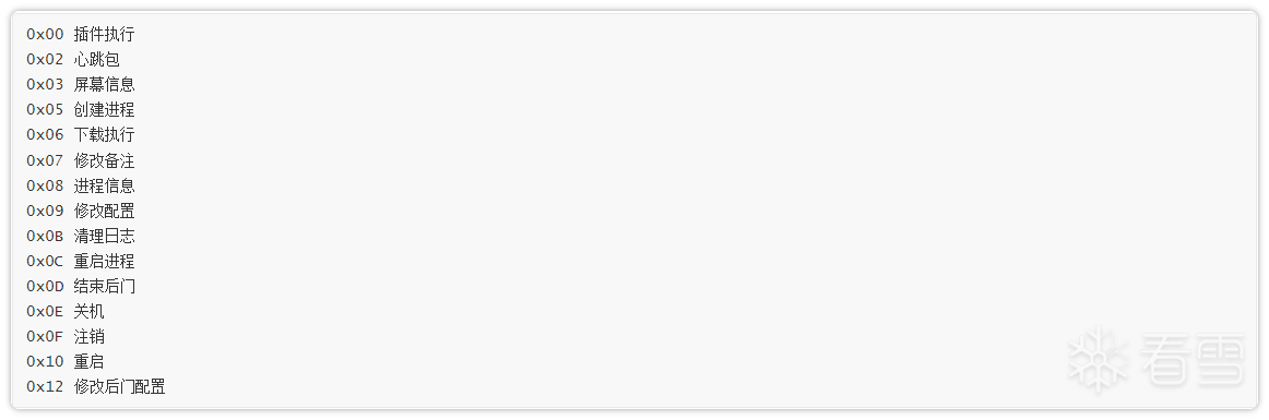 0x0C 重启进程、0x0D 结束后门、0x0E 关机、0x0F 注销、0x10 重启。