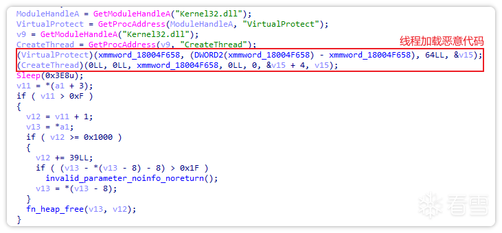 之后,修改内存属性并创建线程,以执行恶意代码。