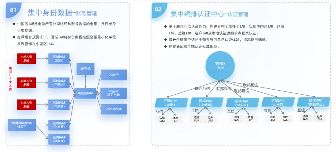 又或者全球性企业,在不同国家区域有各自本地化部署的IAM系统。通过身份编排技术,可以帮助企业快速统管统控集团的用户中心、认证中心、授权中心,确保用户从不同区域登录得到一致体验,并从合规要求进行统一认证编排,助力企业以集团视角对所有数字化业务可视、可管、可控。