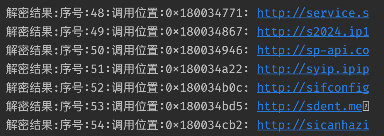 同时,样本调用的很多常量字符串也是加密后存储的,python实现其解密代码获得部分常量明文,包括主备C2域名、用于获取设备公网出口IP的API: