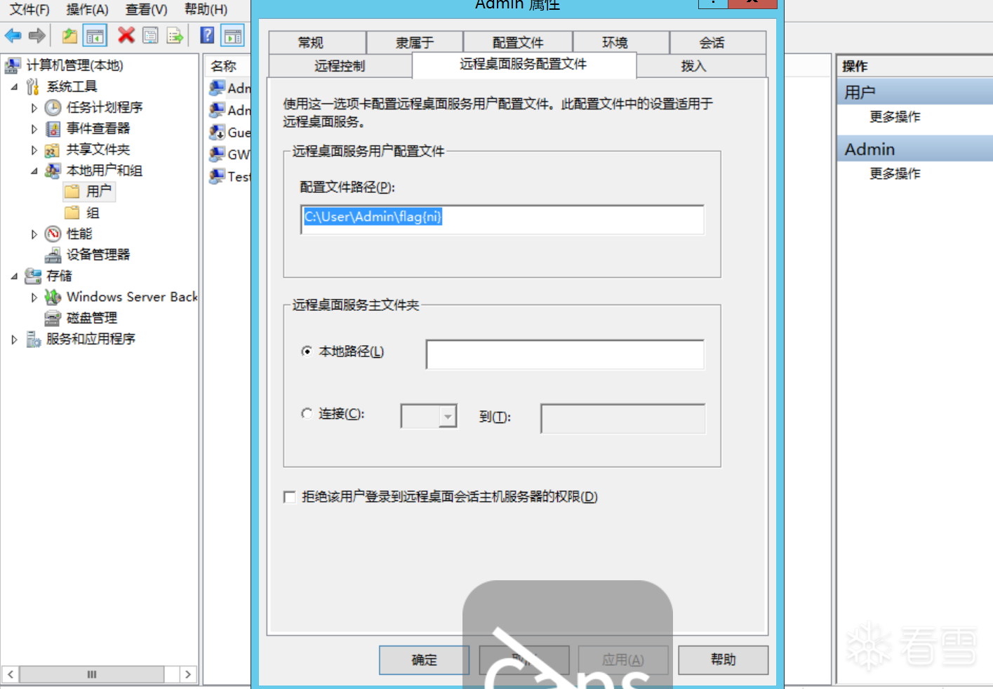 注册表中,本地用户和组管理器均可查看,可以看到多个用户名,通过一一排查,可以得知Admin为可疑用户,右键查看属性可以得知flag