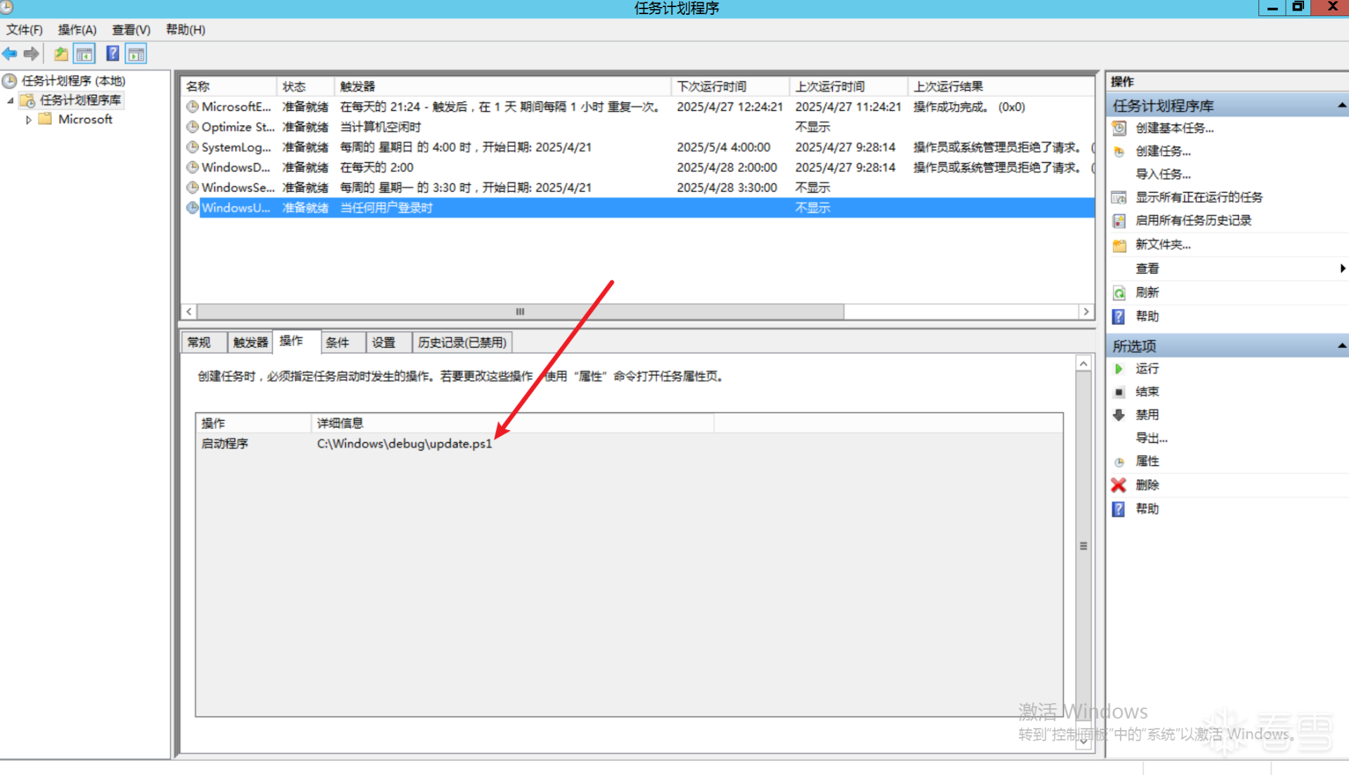 首先检查计划任务,找到可疑任务并查看详情信息,发现指向C:\Windows\Temp\update.ps1,