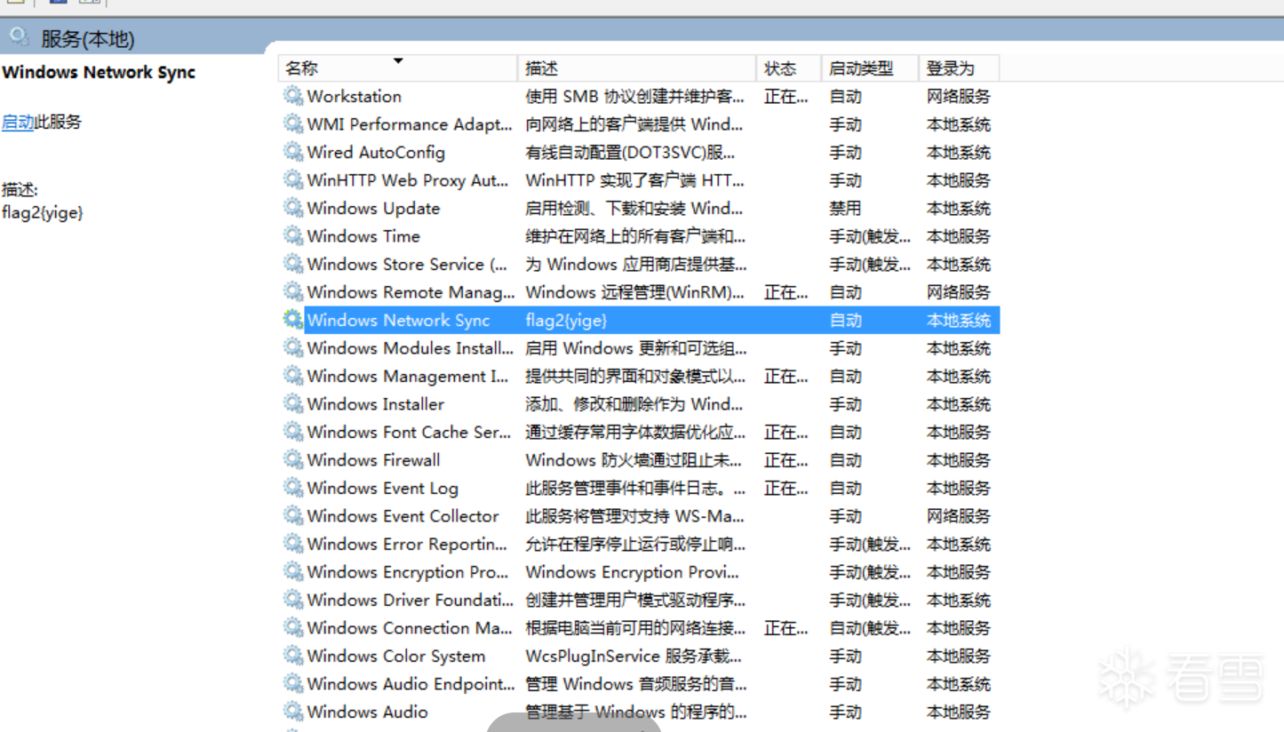 输入services.msc打开系统服务查看详情,找到对应的可疑服务,可以看到描述中有flag2
