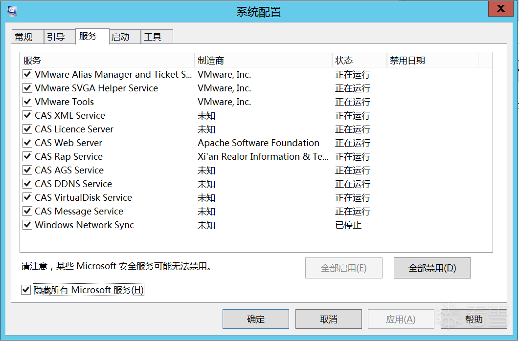 输入msconfig,检查系统配置中的服务,勾选隐藏所有Microsoft后,发现可疑系统服务Windows Network Sync