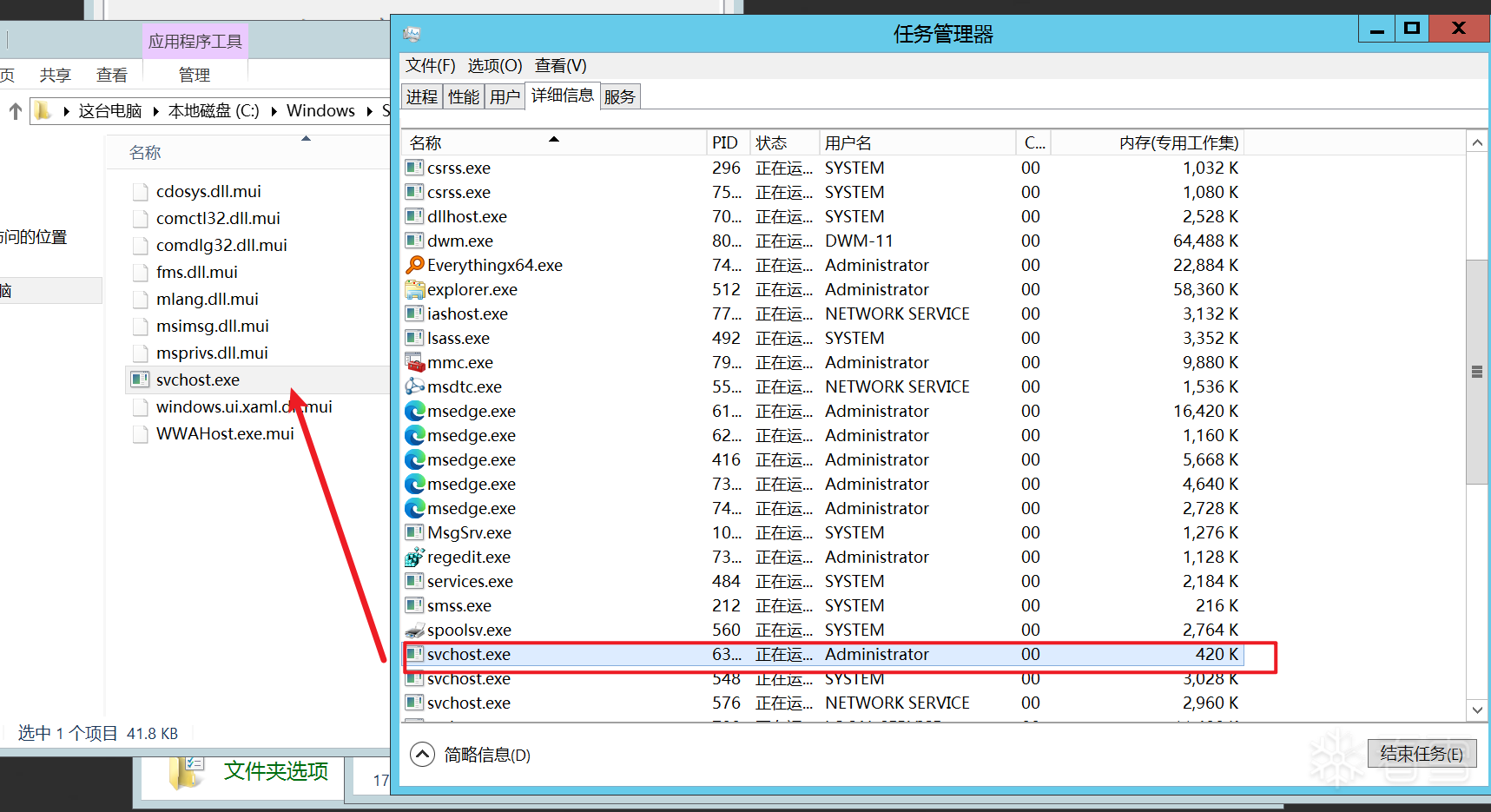 通过排查系统内的进程,找到可疑的进程svchost.exe,