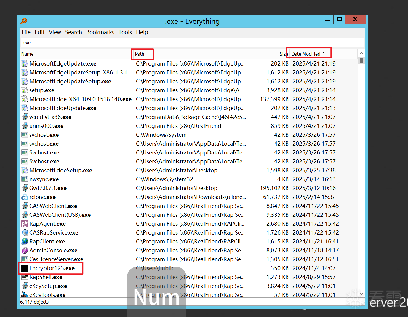flag{Encryptor123.exe}通过题目提示知道要找的是加密程序,在真实的应急响应中,寻找加密器主要通过加密文件的修改时间、加密器常见路径(启动项,music,temp,users等目录下)、常见的加密器名称等线索排查加密器,在这里我们可以上传一个everything方便查找,可以看到一个名为Encryptor123的程序,很明显这就是我们要找的目标