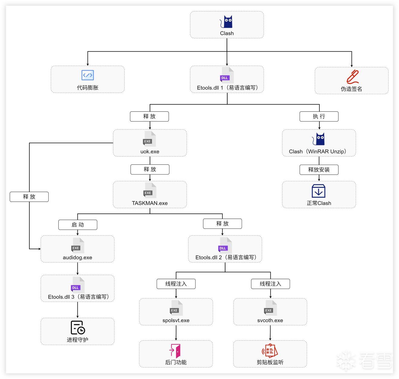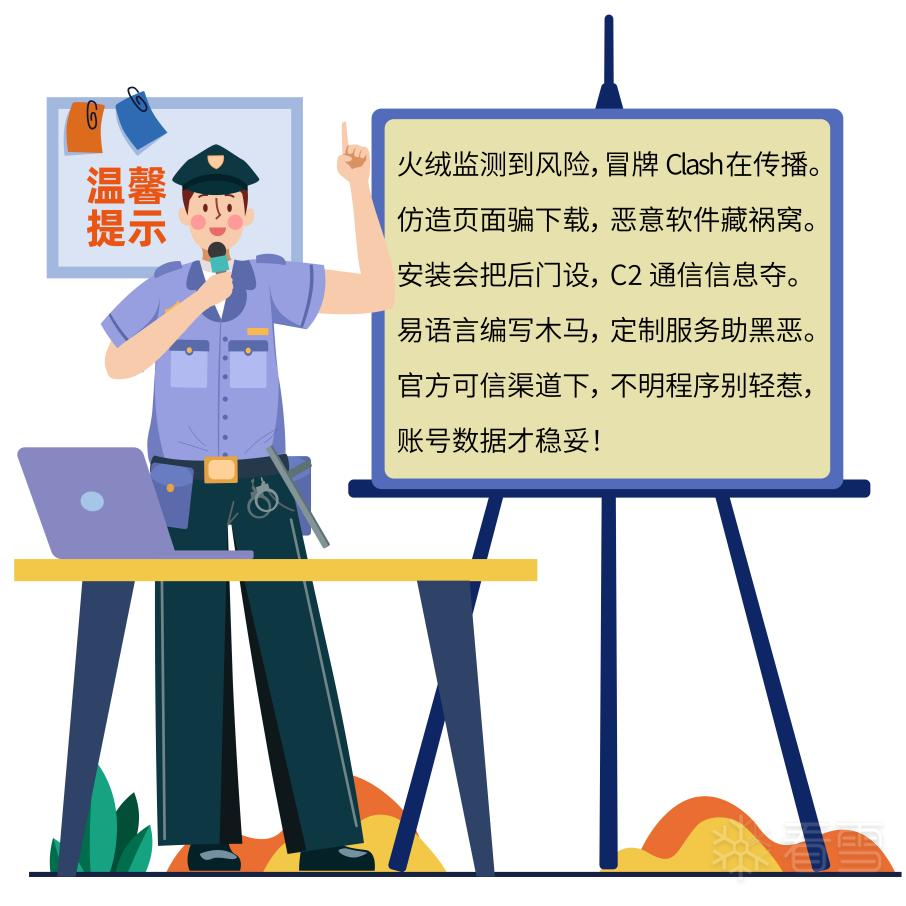 近期,火绒安全情报中心监测到一款伪装成Clash(代理工具)的程序正在网络上传播。该程序的官方网站通过模仿Clash的下载页面,诱骗用户下载恶意软件。在安装过程中,该恶意软件会进行C2通信并植入持久化后门,进一步窃取敏感信息。经溯源分析,这款恶意软件是由易语言编写的木马,其存在相关开发者提供私人定制易语言服务,为他人的黑灰产活动提供支持。在此提醒广大用户,一定要从官方或可信渠道下载软件,以免因使用不明来源的程序而导致账号被盗或数据泄露。目前,火绒安全产品可对上述病毒进行拦截查杀,建议广大用户及时更新病毒库以提高防御能力。