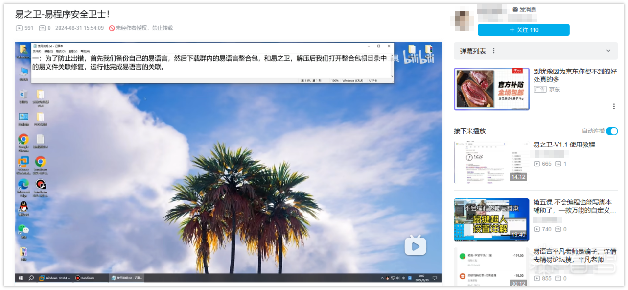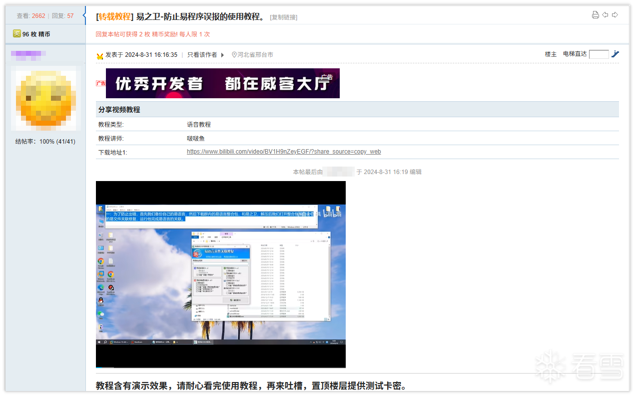 对病毒中的“易之卫(病毒模块DLL中的字符串)”进行分析后发现,其为易语言提供免杀支持,主要通过代码体积膨胀以及加VMProtect代码虚拟化的方式来逃避杀软检测,并以“卡密”验证的形式公开售卖,同时还在B站等平台进行推广。