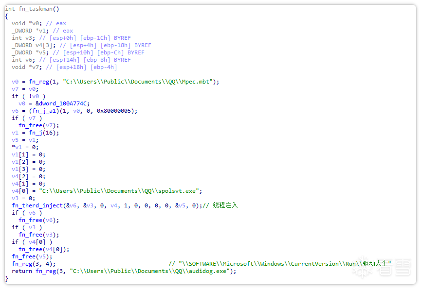 TASKMAN.exe与Clash.exe加载方式相同,均采用释放Etools.dll3的方式,并加载其导出函数whitetool函数。通过对进程名匹配来执行相应函数,之后借助线程注入(指令模拟)的方式执行spolsvt.exe,同时启动audidog.exe(进程守护程序)。