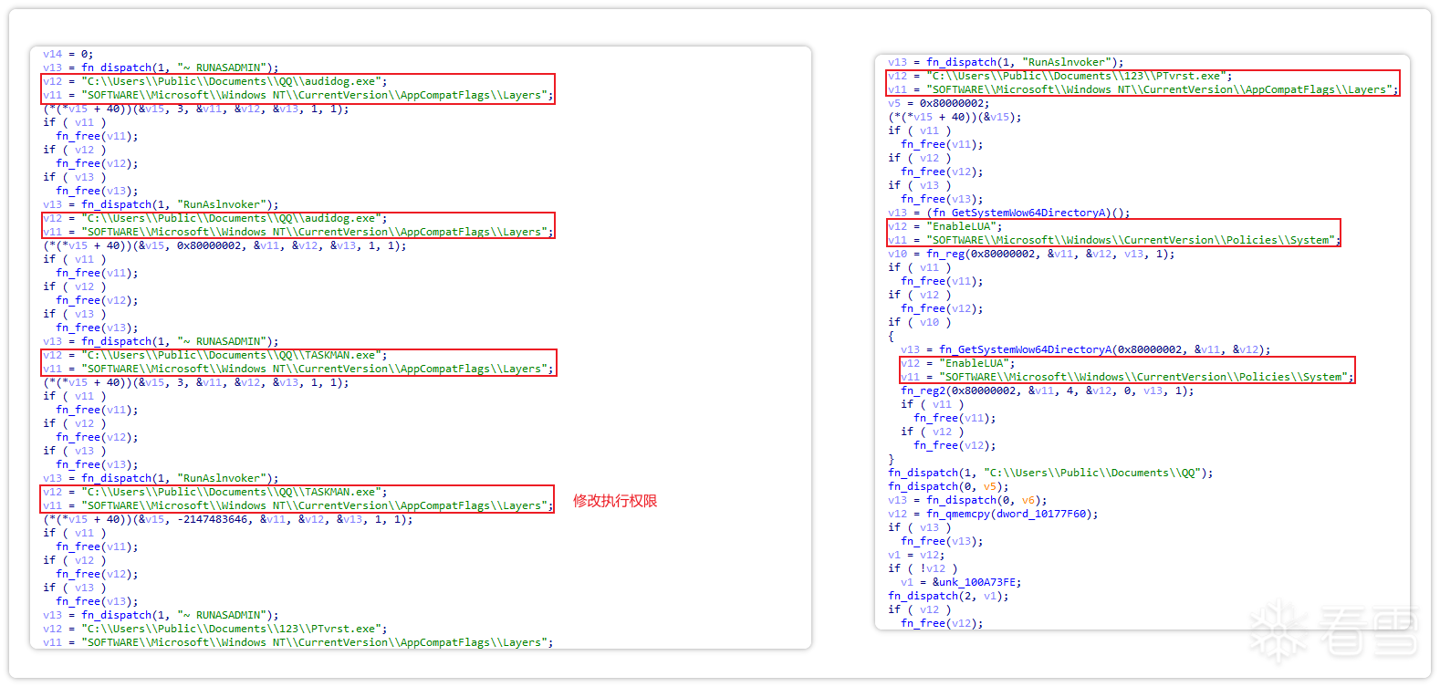 之后,病毒利用AppCompatFlags的兼容性标志,强制目标程序以管理员身份(~ RUNASADMIN)或用户权限(RunAsInvoker)运行,改变UAC行为,绕过权限提升提示。