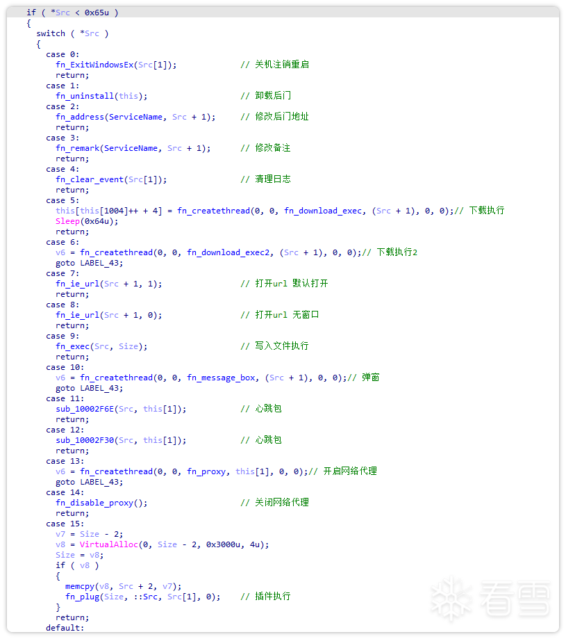 深入分析该DLL后,发现其主要借助自定义派遣函数来执行恶意代码。其具体功能由参数一决定。以下是其参数一对应的各项功能。