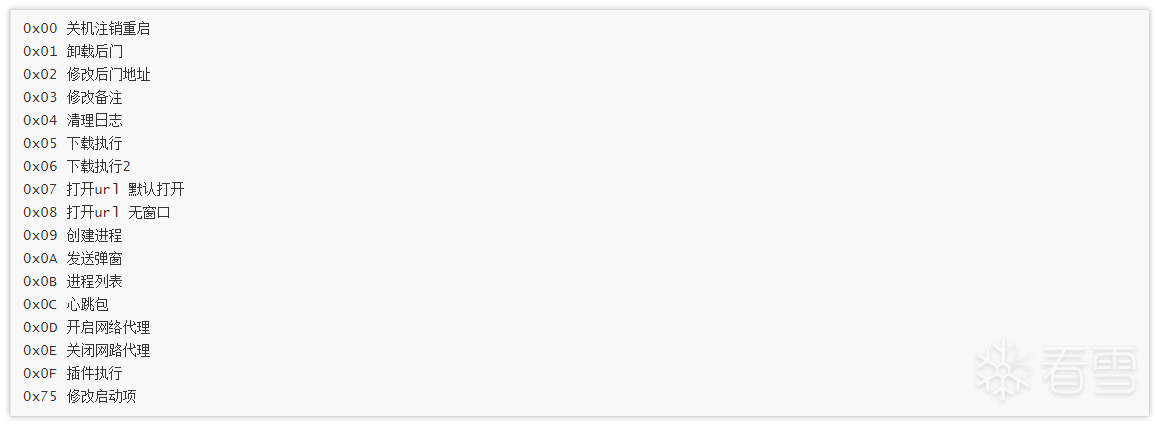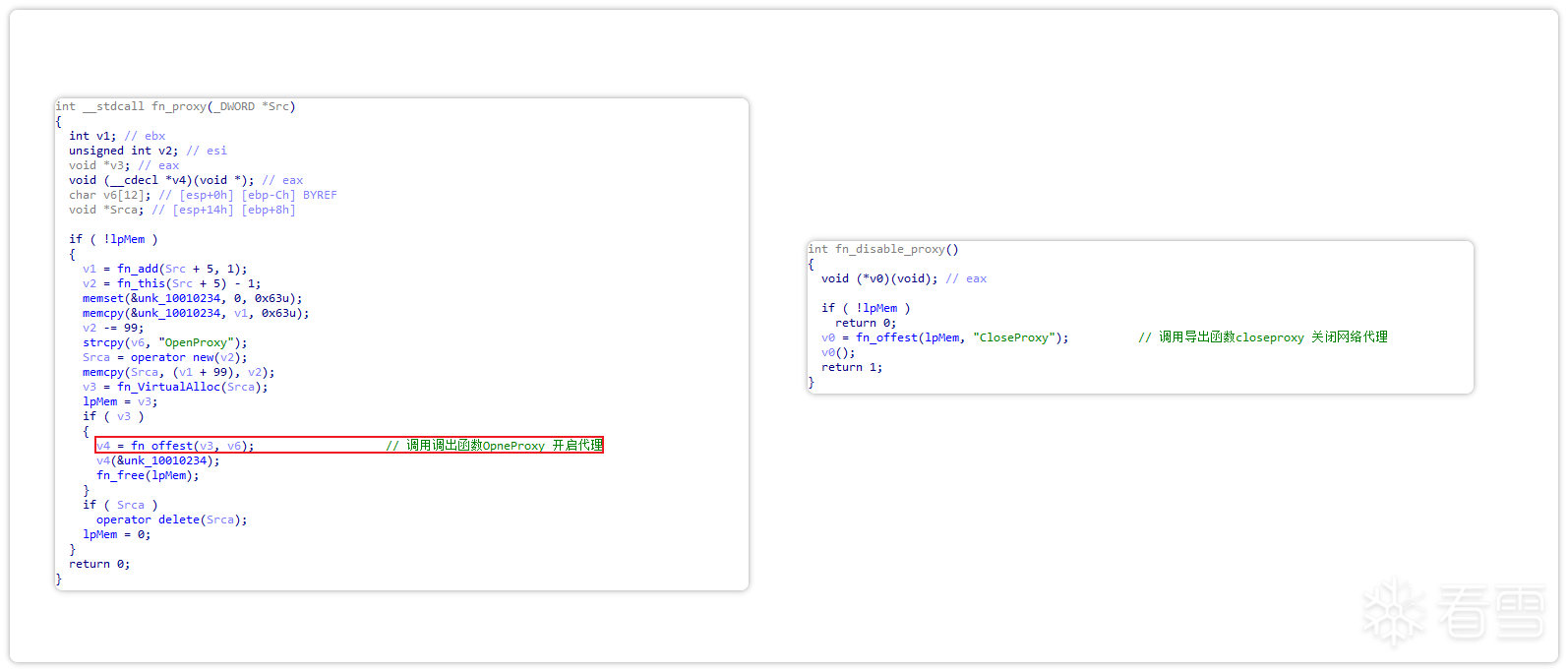 0x0D开启网络代理与0x0E关闭网络代理:网络代理以插件形式执行,通过内存加载DLL的方式,调用其导出函数OpenProxy开启代理,调用CloseProxy关闭代理。