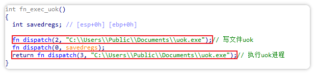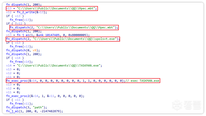 2.调用fn_dispatch()函数对路径、资源或注册表进行设置,或执行模拟行为。