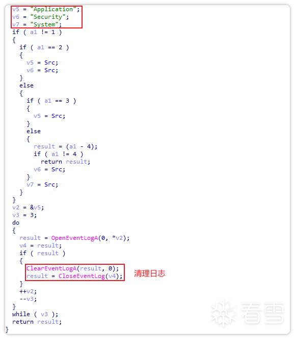 0x04清理日志:通过有针对性地删除系统中“Application”(应用程序)、“Security”(安全)及“System”(系统)这三类关键事件日志,以清理自身的攻击轨迹。