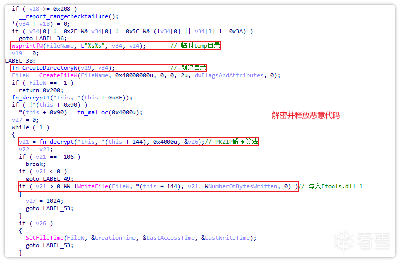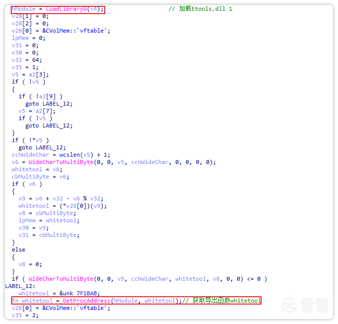 接着,样本利用LoadLibraryA动态加载已解密的Etools.dll1,并调用其导出函数WhiteTool,执行流程如下。