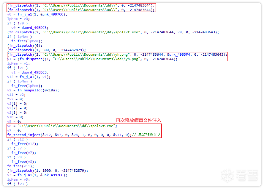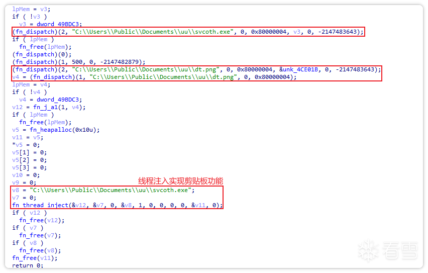 3.从PNG文件中提取payload,并调用fn_thread_inject()函数,将某些执行体(如EXE文件)注入到其它线程中,以实现后门功能。