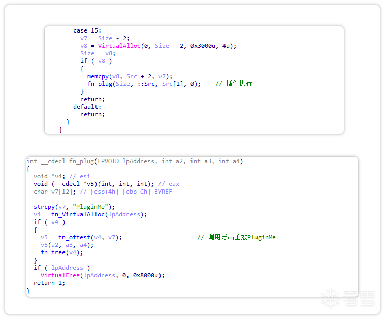 0x0F插件执行:通过分配可读、可写、可执行的内存,并以内存加载DLL的方式修复PE,随后调用导出函数PluginMe来实现插件的加载。