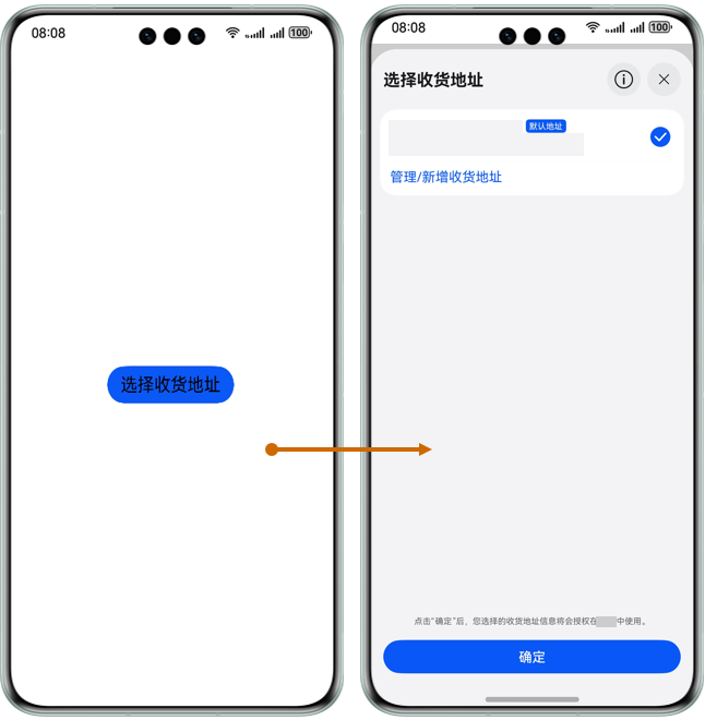 选择收货地址Button支持应用调用对应Button组件快速拉起地址选择页面,并返回用户选择的收货地址。当用户在应用内购物或寄件时需要填写地址信息,可以单击"选择收货地址Button"按钮,拉起华为账号下已保存的收货地址信息,选择对应地址或对地址信息进行管理。