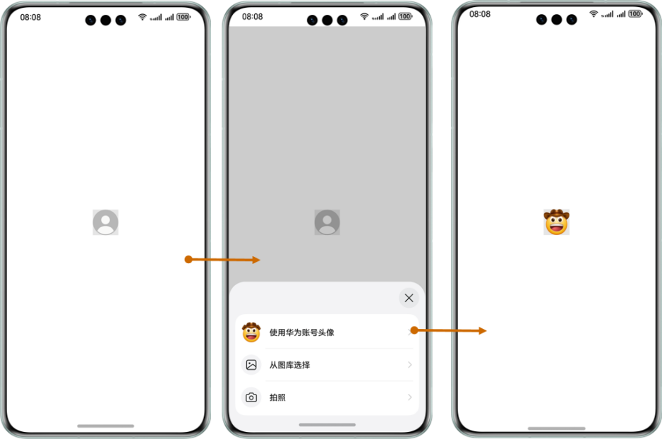 选择头像Button适用于应用需要获取或设置头像的场景,用户通过点击选择按钮拉起半模态选择头像页面,在该页面中可直接选择使用华为账号头像,也可从图库或实时拍摄选取头像。