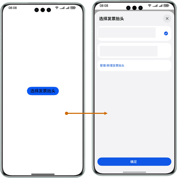 选择发票抬头Button支持应用调用Button组件拉起华为账号下发票抬头选择页面,供用户完成已保存发票抬头选择,同样,用户还可以对已有发票信息进行管理或新增发票信息。