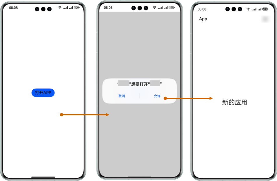 打开App Button支持应用通过调用组件打开另一个应用,当用户需要从当前使用中的应用跳转至其他应用时,单击"打开App Button"按钮,出现提示弹窗,用户单击"允许",即可跳转至新的应用界面。