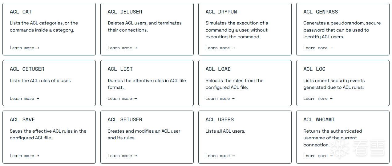 用于配置ACL的命令有12个,一些业务功能成对实现,比如ACL SETUSER/DELUSER负责创建/删除一个账户,ACL SAVE/LOAD负责ACL的备份和恢复。其他业务功能单独实现,比如ACL CAT [category]用于索引当前账户,指定类别的访问权限。