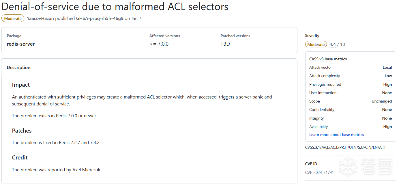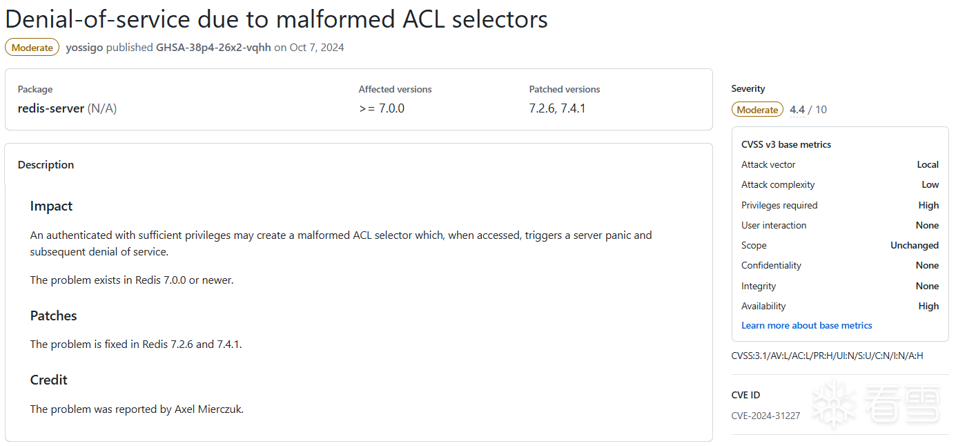Redis是一个开源的高性能内存数据库,并且开启了安全策略,针对8.0.x\7.4.x、7.2.x和6.2.x及以上版本的Redis漏洞进行公开披露[1]。