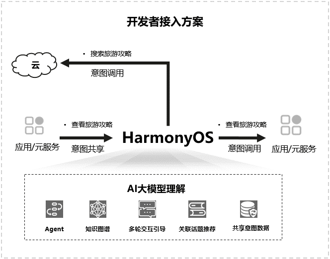 开发者需要按照意图定义,进行意图注册并实现意图调用;用户通过对小艺对话进行自然语言输入,小艺理解语义转换成意图调用(含意图参数),执行意图调用实现对应交互体验。