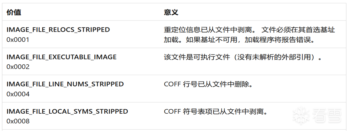 关注一下SizeOfOptionalHeader记录的是MAGE_OPTIONAL_HEADER,因为MAGE_OPTIONAL_HEADER的大小也是不固定的,NumberOfSections表明节表也就是节区的数量,Characteristics字段表明PE文件的类型,如IMAGE_FILE_DLL(0x2000)表明是DLL文件,IMAGE_FILE_EXECUTABLE_IMAGE(0x0002)表明是EXE可执行文件