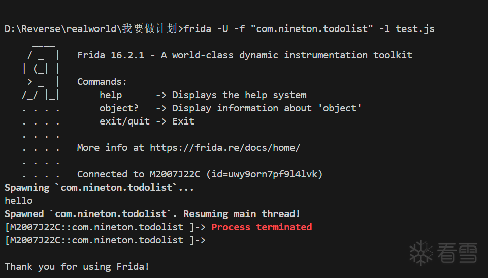 用frida先注入一下,在输出hello之后直接被杀掉
