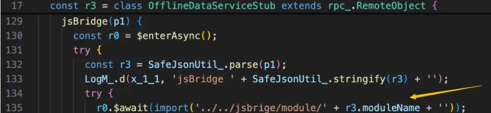其中的一个RPC功能是COMMAND_JS_BRIDGE,如下图所示,该功能会接收调用者可控的字符串参数作为JSON解析,并将调用者可控的moduleName字段拼接到import函数的参数中: