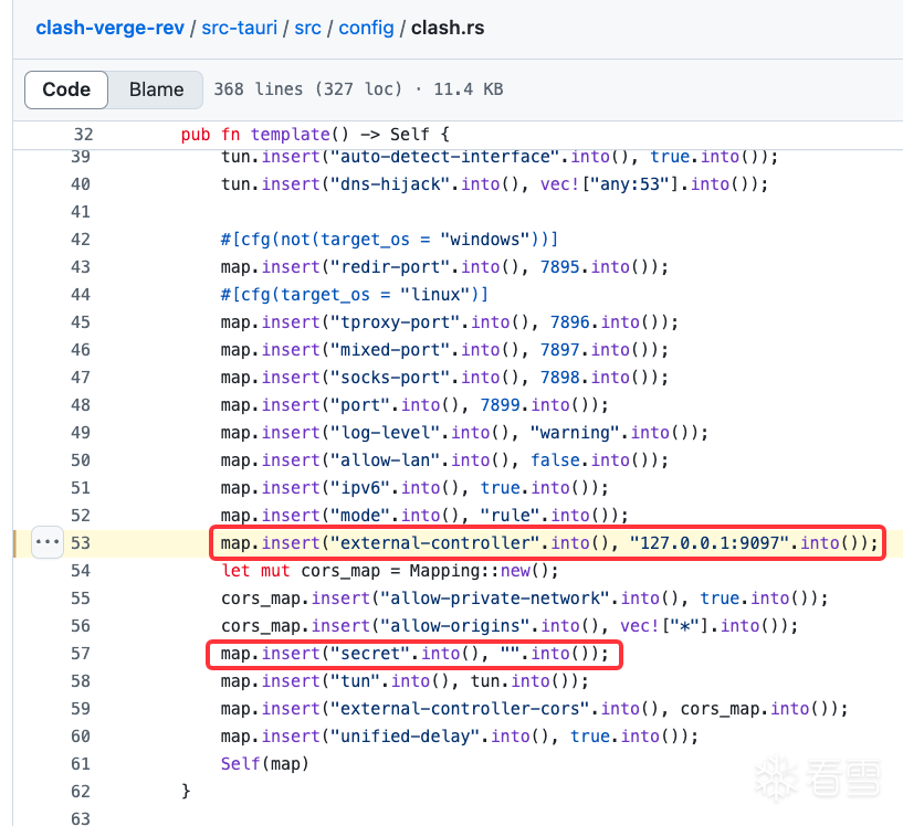 下图是Clash Verge的默认配置模版,它默认在127.0.0.1:9097开启API服务,且secret字段为空,不做鉴权。并且该API服务存在CORS问题,可被恶意网页利用