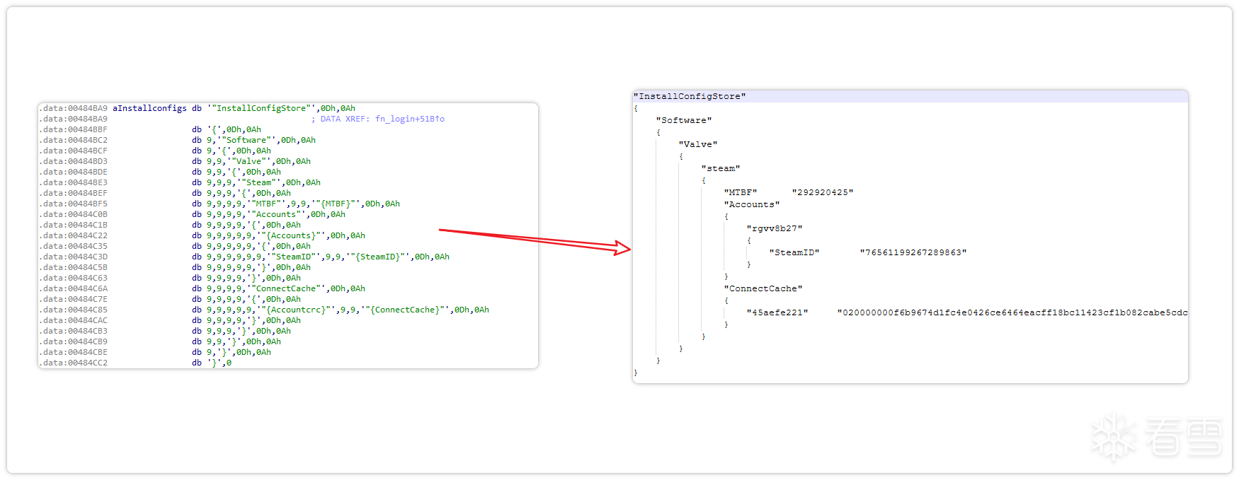样本利用获取到的Steam PID读取内存,并通过PID获取进程句柄。随后,匹配内存特征,获取eya密钥。