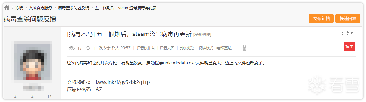 近期,火绒安全论坛收到大量用户反馈,知名软件《壁纸引擎(Wallpaper Engine)》的创意工坊中出现了大量携带Steam盗号病毒的“黄油”。这些“黄油”一旦被订阅或使用,其携带的恶意代码会在后台悄悄运行,窃取用户的Steam账号信息,进而导致用户账号被盗、虚拟资产被转移等。建议广大用户在使用《壁纸引擎》时提高警惕,切勿随意下载来路不明的创意工坊作品。目前,火绒安全产品可对上述病毒进行拦截查杀,建议广大用户及时更新病毒库以提高防御能力。