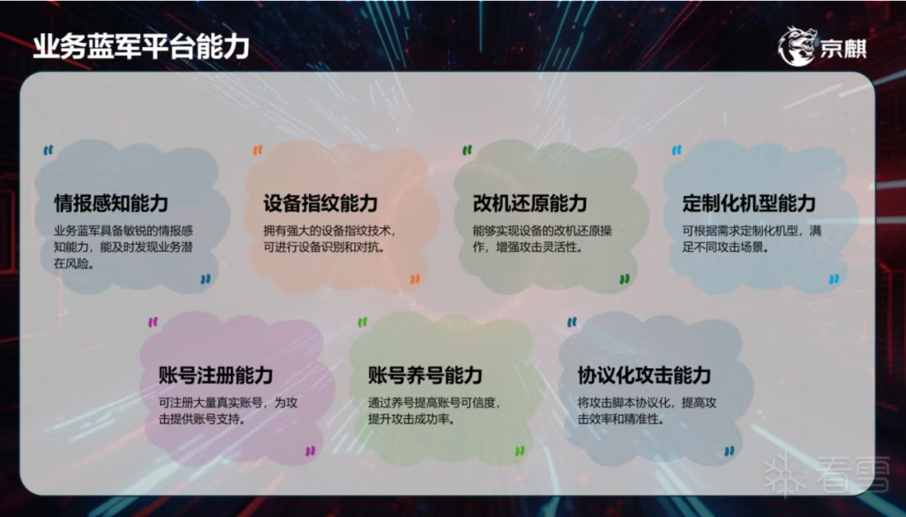 另外一部分是设备指纹能力。我们有很多同学可以做专业的设备指纹技术对抗、设备机器的改机还原以及定制化机型的能力。通过这几项能力,我们可以做到账号的批量注册、批量养号。这个过程中更多的是我们和阿里自己的自身业务去做业务对抗,从而去发现他们的策略是否有效,是否可以被绕过,是否覆盖面足够广,召回足够全。