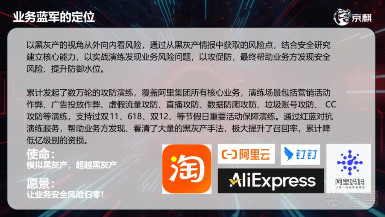 核心就是这些风险池,我们能告知到业务,蓝军提供这样的演练的能力和防控的水位,最终能够赋能给到阿里的这些对应所有的业务方。通过我们这样的业务能力能给业务带来在业务风控场景下,他们以前没有关注到的点,或者叫做防控水位比较低的点。因为在这过程中,更多的场景都是会造成平台的资损,以及一些商家、广告主、广告方的一些资损,这些都是真金白银的损失。它和漏洞不太一样的点在于,漏洞是有风险,但现阶段业务风险的话,它是直接造成平台的客观资金损失。
