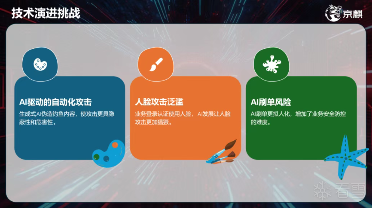 第一,AI驱动的自动化攻击。就如刚才袁老师提到的,比如说钓鱼的场景,大家以前都是很固定化的内容。但现阶段AI可以伪造非常多的钓鱼内容,甚至可以做一个完整的原生广告内容系统,并具备隐蔽性,配合对应的钓鱼网站和钓鱼页面,能够做到非常真实的攻击行为。这种情况下,对于普通的大众用户和消费者,以及企业的员工用户,他们的防控意识如果没有那么高,面临的挑战会非常大。