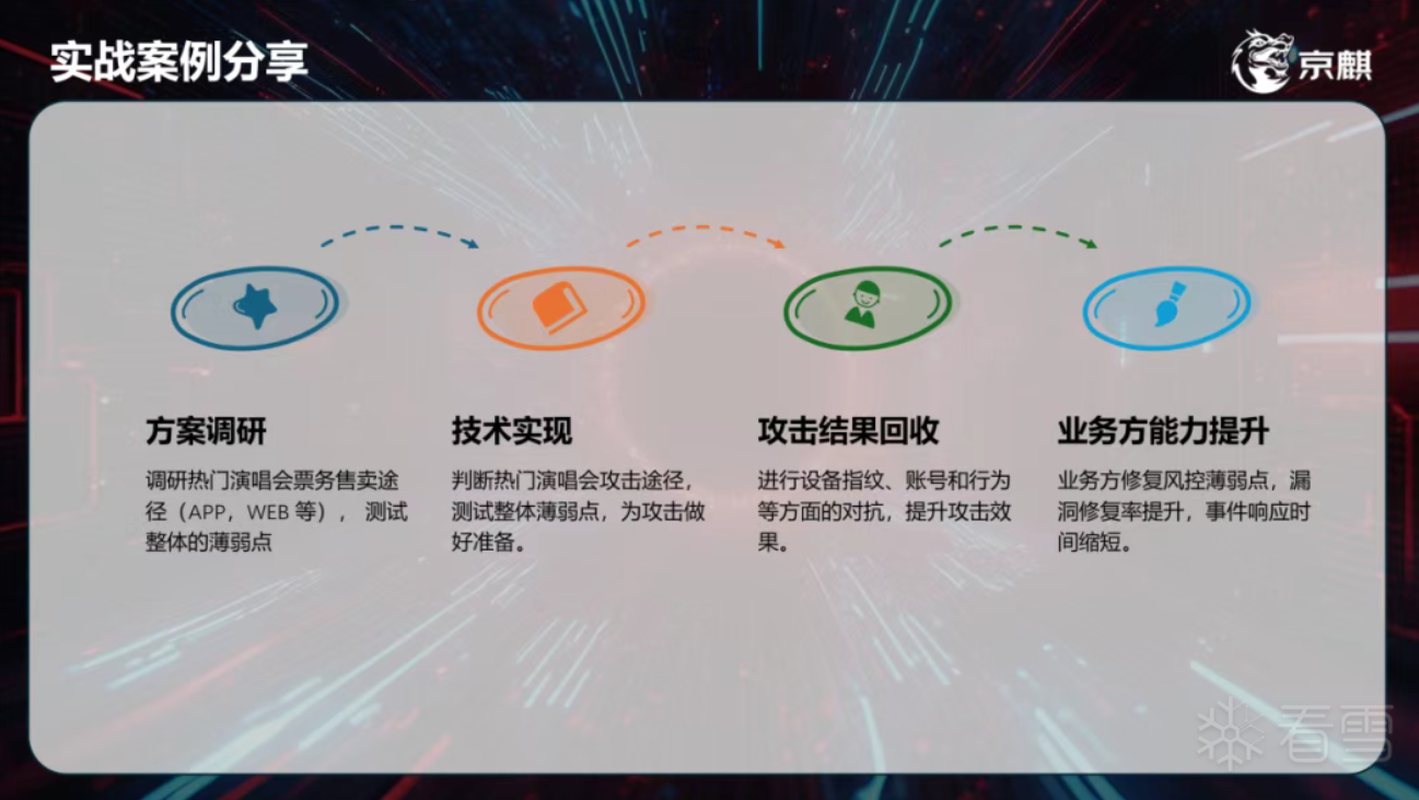 我们发现这些内容后,把最终的攻击结果回收,方便我们最终出安全的演练报告。出完报告后,和业务方一起去做对应的能力提升。比如说在刚才的演唱会场景下,如果我们在H5场景下做演练,可以演练成功,抢到多张票。我们会和业务方沟通,APP的抢票途径风险水位更低也就是说防控能力更好,但web场景下水位很低。因此,我们建议把web场景的链路整体入口关掉,把所有用户引流到APP端。这样,整体的防控水位就能做到快速提升,从而帮助业务发现和修复风控的一些薄弱点,提升漏洞的修复率,缩短事件的响应时间。